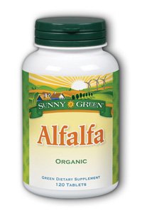Alfalfa by Sunny Green 120 Tablet Often referred to as the father of all foods Alfalfa is a perennial of the pea family that is grown throughout the world. The chlorophyll in Sunny Green Alfalfa is intended to provide nutritive support for normal healthy body chemistry. Size 120ct 500mg Tablet Directions As a dietary supplement take 3 tablets daily with meals or a glass of water. Serving Size 3 Tablet 40 Servings per container Ingredients Amount per serving Daily Value + Dietary Fiber 1 g 2 Total Carbohydrate 1 g 1 Alfalfa (Medicago sativa) (leaf) 1.5 g Key to Ingredients Daily Value not established. + Percent Daily Value is based on a 2 000 calorie diet. Values differ depending on age Values differ depending on age Other Ingredients Magnesium Stearate Other See product label for more information.