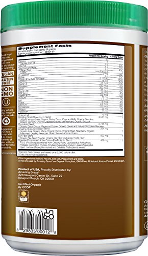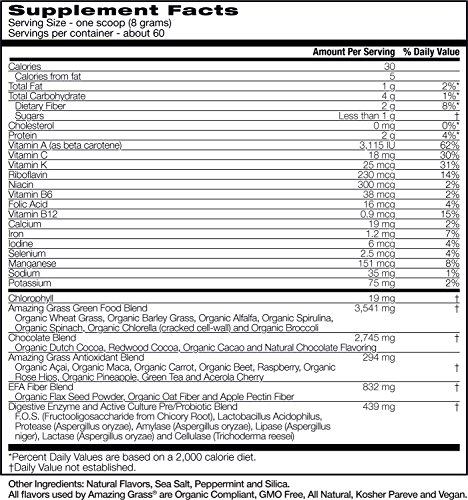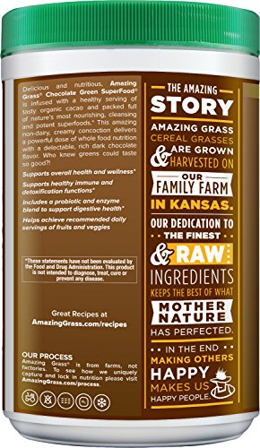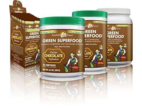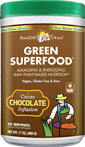 Green SuperFood Drink Cacao Chocolate 8.5 oz Pwdr – Amazing Grass Chocolate Green SuperFood is a delicious chocolate drink powder to help you achieve your 5 to 9 daily servings of fruits and vegetables. A full spectrum of alkalizing green superfoods, fruits, and support herbs unite with organic Acai, Maca and Cacao to provide a powerful dose of whole food nutrition with a delicious dark chocolate taste.