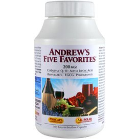 ANDREW’S FIVE FAVORITES is Andrew Lessman’s personal blend of his five favorite ingredients to add to your daily multivitamin. The formula begins with the unparalleled protection of pure, natural Coenzyme Q-10. CoQ10 is essential for all cellular energy production, while also providing powerful anti-aging and antioxidant protection. CoQ10 is required for our most important organs (heart, brain, liver, etc.) to function their best, particularly as we age. Andrew’s next favorite is Alpha Lipoic Acid (ALA), which is referred to as the Universal Anti-Oxidant because of its unique ability to protect both aqueous (water) or lipid (oil-based) environments, thus enabling ALA to deliver its benefits anywhere in the body. ALA’s unique properties allow it to be particularly effective in protecting our nervous system and brain, along with the liver, kidneys and immune system. Andrew also includes two of nature’s most protective and beneficial molecules from the world’s most well-researched beverages: EGCG from Green Tea and Resveratrol from Red Wine. EGCG is credited with the myriad of health benefits of Green Tea and the Asian diet, while Resveratrol has been assigned that same role in the health benefits of Red Wine and the Mediterranean diet. Lastly, Andrew includes Pomegranate because of its rich complement of uniquely protective polyphenols called Punicalagins and Ellagic Acid. Our unique extract of Pomegranate provides an exceptional 40% standardization of each of these two exceptionally protective compounds. Andrew’s Five Favorites is a unique combination of protective ingredients that after more than 30 years of creating vitamins, Andrew has concluded, are the five most important and well-researched ingredients to add to your daily vitamin regimen. These statements have not been evaluated by the Food and Drug Administration. This product is not intended to diagnose, treat, cure or prevent any disease.
