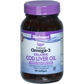 Natural Omega-3 Icelandic Cod Liver Oil by Bluebonnet 90 Softgel Natural Omega-3 Icelandic Cod Liver Oil 90 Softgel Bluebonnets Natural Omega-3 Icelandic Cod Liver Oil Softgels supply DHA and EPA from premium pharmaceutical grade cod liver oil as well as other important nutrients (e.g. vitamins A D3). The cod liver oil used in this formula is derived from deep sea cold water cod caught off the pristine coastal waters of Iceland that has been cold pressed and has undergone a 4-step purification process virtually eliminating all heavy metals (e.g. mercury) PCBs and other contaminants as well as the unpleasant fishy taste and odor typically associated with marine fish oils. In addition a more bioavailable stable natural triglyceride form of cod liver oil is used instead of the common synthetic ethyl ester form which often becomes oxidized rancid. Plus this product has been 3rd party tested for purity and potency. Available in easy-to-swallow softgels for maximum assimilation and absorpti
