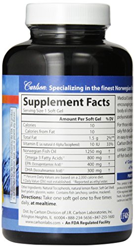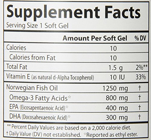 Each softgel has 1250 mg of Norwegian Fish Oil and 800 mg of Omega-3 Fatty Acids