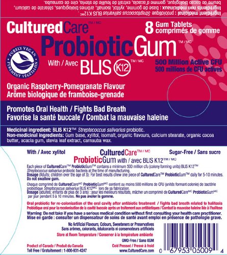 CulturedCare Probiotic Gum with BLIS K12 is the only chewing gum dosage form of a patented oral probiotic strain – Streptococcus salivarius K12. BLIS is an abbreviation for Bacteriocin-Like Inhibitory Substance. BLIS is the naturally occurring component of certain strains of micro-organisms (probiotics) which control undesirable and disease-causing bacteria and promote oral health. BLIS K12 is the special BLIS probiotic strain derived from Streptococcus salivarius.