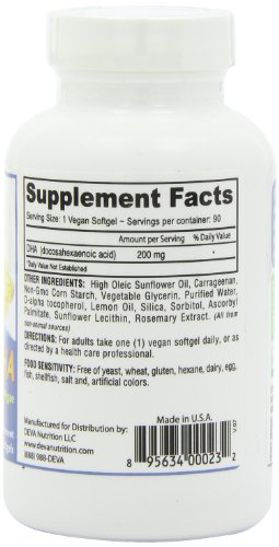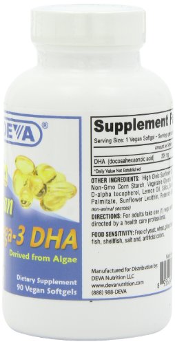 DEVA Vegan Omega-3 DHA is a quality product derived from algae and packaged in non-animal softgels made from carrageenan and starch. This makes an excellent alternative to fish oil and can be confidently used by vegetarians and vegans alike. DHA is a long chain polyunsaturated omega-3 oil. It is an essential fatty acid, meaning that the body doesn’t produce it by itself and it must be obtained in the diet. DHA is one of the most prominent essential fatty acids in the brain and in the retina. DEVA Omega-3 DHA is 100% vegan, vegetarian and is certified by the Vegan Society, the non-profit organization that actually invented the word “vegan”.