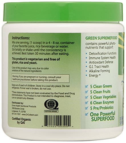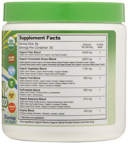 USDA organic. Non GMO ingredients. Gluten-free. Soy free. Contains alkalizing vegetable ingredients. This product is vegetarian and free of gluten, rice and yeast. Green super food contains powerful phytonutrients that support: detoxification functions, immune system health, antioxidant defense, G.I. Tract health alkaline forming, energy. 5 clean greens. 5 clean fruits. 5 clean vegetables. 6 clean enzymes. 5 pre/probiotics. One powerful super food.