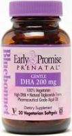 Early Promise Prenatal Gentle DHA 200mg by Bluebonnet 30 Veg Softgel Early Promise Prenatal Gentle DHA 200 mg Vegetarian Softgels Bluebonnets Early Promise Prenatal Gentle DHA 200 mg Vegetarian Softgels provide lifes DHA a pharmaceutical-grade vegetable-based docosahexaenoic acid (DHA) in a natural triglyceride form derived from marine algae. Plus lifes DHA is the only FDA-approved DHA currently used in U.S. infant formulas. Available in easy-to-swallow vegetarian softgels for a truly vegetarian formula from the inside out. Early Promise Prenatal is a registered trademark of Bluebonnet Nutrition Corporation. lifes DHA is a trademark of Martek Biosciences Corporation. Other ingredients Algal oil soluble food starch glycerin high oleic sunflower oil water sea vegetable extract sorbitol ascorbyl palmitate tocopherols natural flavor lecithin (sunflower) beta-carotene natural caramel color. Contains Soybeans Free of milk egg fish crustacean shellfish tree nuts peanuts and wheat. Also free