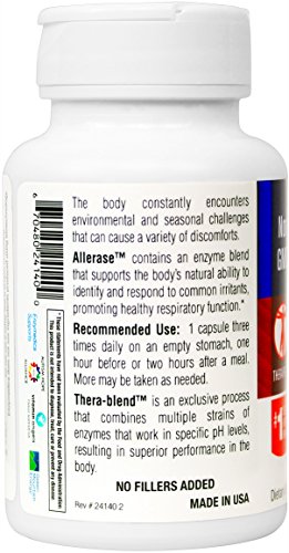 Allerase contains high amylase activity to naturally support common symptoms associated with seasonal issues. Allerase may also help to reduce sugar cravings. Allerase contains a high potency blend of Thera-Blend Amylase enzymes. While amylase is well known for being able to break down carbohydrates, it has another important function. Histamine causes amylase to be released by the body. This can contribute to an amylase deficiency, so supplementation may provide a balancing affect. Also in the formula is the enzyme Mucolase. Mucolase is a protein digesting enzyme that targets and breaks down excess mucus. Taken on an empty stomach, the combination of amylase and Mucolase enzymes offers all natural, non drowsy support for seasonal issues. Sugar Imbalance, Sugar Intolerance: Amylase also supports the breakdown of sugar into usable forms. Fatigue, anxiety and headaches are all byproducts of the body’s inability to utilize the amount of sugar being consumed. Amylase may help control sugar cravings by promoting healthy blood sugar levels.