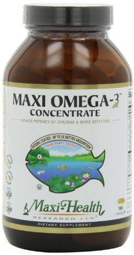 Maxi Health is proud to provide you with our purest and most potent fish oil. It’s Maxi Omega 3 Concentrate. It’s a high grade, certified kosher concentrated fish oil formulated in a vegetarian enteric-coated capsule. The result of industrialization has been diets with more food but less nutrition resulting in memory and concentration loss, heart disease, strokes, adult diabetes, intestinal diseases, Crohn’s disease, various types of depression, hyperactivity and attention deficit disorder in children, arthritis, lupus, psoriasis, asthma, allergies, and Alzheimer’s. Maxi Omega-3 Concentrate can help protect you from all of this and more. It has often been found to be of value where these conditions already exist. Enteric-coated fish oil is the best way to supplement Omega-3 intake. It is much better absorbed then non-enteric coated fish oils and achieves optimal release in the intestines (not in the stomach). That also means no annoying fish aftertaste or indigestion! Why is Maxi Omega 3 Concentrate , the fish oil supplement of choice? It’s has the highest concentration of its kind in a kosher, vegetarian capsule. It has been tested by an independent laboratory for accurate EPA/DHA potency to assure label claim, and found to have no detectable levels of mercury, lead, PCB’s and other impurities which are common in fish oils. Invest in your health for today and tomorrow. Get Maxi Omega 3 Concentrate today!