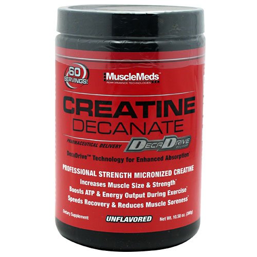 DecaDrive Technology for Enhanced Absorption Professional Strength Micronized Creatine Increases Muscle Size & Strength. Boosts ATP & Energy Output During Exercise. Speeds Recovery & Reduces Muscle Soreness. The New Bodybuilding Standard In Creatine Supplement! Creatine Decanates scientifically advanced purified, potent and most clinically studied form of creatine with DecaDrive deliver has set a new standard in creatine supplementation. Creatines proven muscle building and strength benefits have made it one of bodybuildings top sports supplements, Now, MuscleMeds scientists have invented a new way to make creatine even better with the creation of Creatine Decanate with DecaDrive. Creatine: The Raw Science! In the development of Creatine Decanate, MuscleMeds scientists conducted an extensive clinical review on the various forms of creatine for building muscle, strength and athletic performance to determine which form really works best. From a pure scientifically research standpoint, Creatine Monohydrate was shown to have the greatest number of scientific efficacy studies on athletes. The tremendous volume of scientific research is incredibly clear-purified creatine monohydrate has been shown to deliver a potent dose of muscle building and power generating ATP to muscle fibers, with the highest degree of clinical evidence. Therefore, MuscleMeds researchers decided to utilize creatine monohydrate in combination with our advanced pharmaceutical DecaDrive Technology deliver in the creation of Creatine Decanate. DecaDrive Shifts You Into Anabolic Overdrive! Creatine Decanate provides a potent dose of purified, micronized creatine via the scientifically advanced DecaDrive Techology, which is designed to promote faster absorption and utilization of creatine. DecaDrive Technology utilizes the pharmaceutical deliver compounds PEG and Decanoate to help promote increased absorption and uptake in the intestines. This powerful infusion of Creatine Decanate delivers maximum