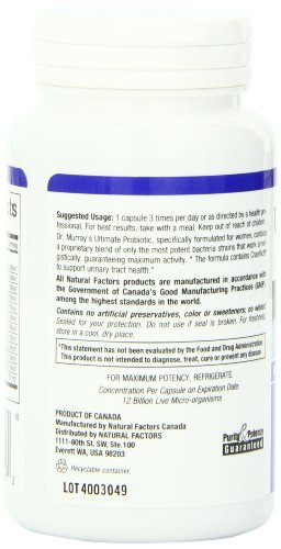 Dr. Murray’s Ultimate Probiotic, specifically formulated for women, contains a proprietary blend of only the most potent bacteria strains that work synergistically guaranteeing maximum activity. The formula contains CranRichâ„¢ to support urinary tract health.;All Natural Factors products are manufactured in accordance with the Government of Canada’s Good Manufacturing Practices (GMP), among the highest standards in the world.;Contains no artificial preservatives, color or sweeteners; no starch or wheat.