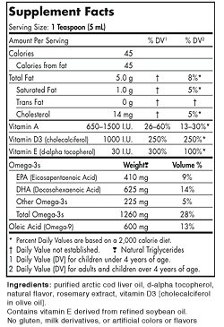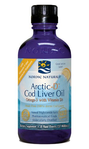Arctic-D, Cod Liver Oil with Lemon 8 oz Great Lemon Taste! Dietary Supplement Supplement Facts Serving Size: 1 teaspoon (5 ml) Servings Per Bottle: 48 Amount Per Serving: Calories 45 Calories from fat 45 Total Fat 5.0 g Saturated Fat 1.0 g Trans Fat 0 g Cholesterol 14 mg Vitamin A 650-1500 IU Vitamin D3 (cholecalciferol) 1000 IU Vitamin E (d-alpha tocopherol) 30 IU Omega-3s DHA (Docosahexaenoic Acid) 625 mg EPA (Eicosapentaenoic Acid) 410 mg Other Omega-3s 225 mg Total Omega-3s 1260 mg Oleic Acid (Omega-9) 600 mg Ingredients: purified arctic cod liver oil, vitamin D3 (cholecalciferol), d-alpha tocopherol, natural lemon flavor, rosemary extract. Suggested Use: One teaspoon daily, with food, or as directed by your health care professional or pharmacist. Warning: Consult with your physician before using this product if you are allergic to iodine, use blood thinners, or anticipate surgery. Keep out of the reach of children Do not take if tamper evident seal is broken or missing. Refrigerate after opening. Best if used within 3 months after opening No gluten, yeast, milk derivatives, or artificial colors or flavors. May contain traces of peanut and/or soy derivatives. Nordic Naturals Arctic-D Cod Liver Oil was developed for people who want the health benefits of DHA, EPA, and natural vitamin D. Nordic Naturals has raised the bar on purity and freshness with our “Gold Standard” Arctic Cod Liver Oil. Nordic Naturals oversees production from sea to finished product-assuring 100% Arctic cod is delivered, within hours of being caught, to our plant for molecular processing in a nitrogen environment. The result-the purest and best tasting cod liver oil. Enjoy the taste of “Pure Health.” *All Nordic Naturals fish oils surpass all pharmaceutical standards for freshness and purity. Every batch is third-party tested, showing no detected levels of heavy metals, dioxins, or PCBs. *These statements have not been evaluated by the Food and Drug Administration.
