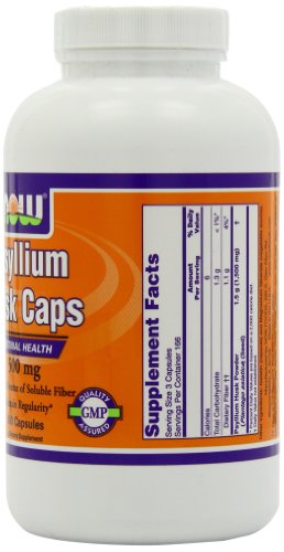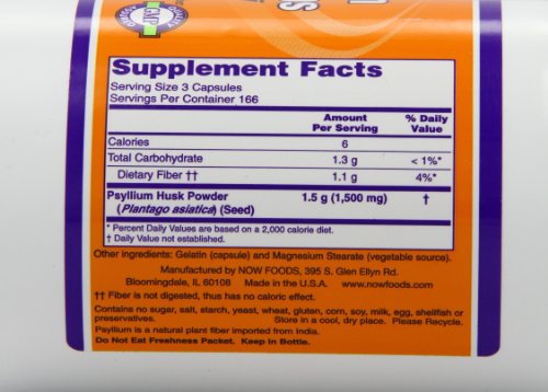 Psyllium Husk 500mg by Now Foods 500 Capsule Psyllium Husk 500mg 500 Capsule Product Surveys have shown that the fiber content of the American diet is typically about half of government recommended levels. Psyllium Husks can be a convenient way to increase the intake of dietary fiber. It has the ability to swell up to 50 times its initial volume when added to liquid. This bulking action can play an important role in maintaining regularity and gastrointestinal health. Excellent Source of Soluble Fiber Helps Maintain Regularity Suggested Use As a dietary supplement take 3 capsules with an 8 oz. glass of liquid twice a day – Or as directed by your healthcare professional. Supplement Facts Serving Size 3 Capsules Servings Per Container 166 Amount Per Serving Daily Value Calories 6 Total Carbohydrates 1.3 g 1 Dietary Fiber 1.1 g 4 Psyllium Husk Powder (Plantago asiatica) (Seed) 1.5 g (1 500 mg) Percent Daily Values are based on a 2 000 calorie diet Other Ingredients Gelatin (capsule) and M