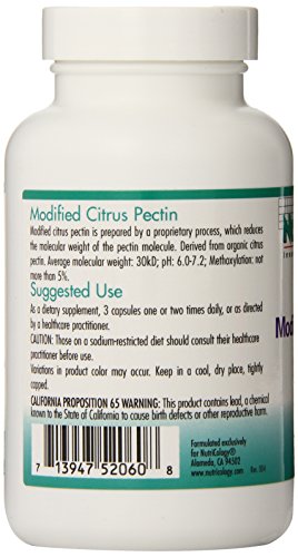 Modified citrus pectin is different from other pectin because of the way it is prepared. It is modified by a proprietary process, which reduces the molecular weight of the pectin molecule. Derived from organic citrus pectin. Average molecular weight: 30kD; pH: 6.0-7.2; Methoxylation: not more than 5%.;Suggested Use: As a dietary supplement, 3 capsules one or two times daily, or as directed by a health practitioner. Other ingredients: Hydroxypropyl methylcellulose, microcrystalline cellulose, L-leucine. This nutrient is of the highest quality and purity obtainable, free of all common allergens (antigens), and does not contain preservatives, diluents, or artificial additives.