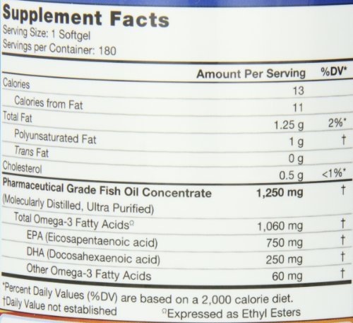 Contains 180 softgels per bottle. Each softgel contains 1,200 mg of Pharmaceutical-grade Fish Oil with highly concentrated Omega-3s (750 EPA, 250 DHA, and 60 Other EFAs)