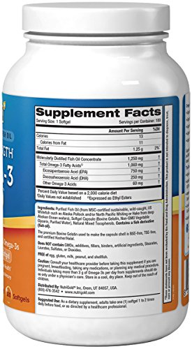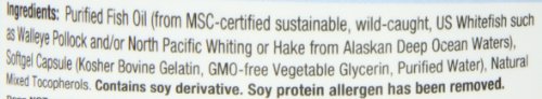 Ingredients: Purified Fish Oil Concentrate (from MSC-certified sustainable, wild-caught, US Whitefish such as Walleye Pollock, North Pacific Whiting or Hake and/or North Pacific Cod from Alaskan deep ocean cold waters), Softgel (Bovine Gelatin, Vegetable Glycerin, Purified Water), Natural Mixed Tocopherols.