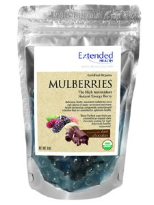 Organic Dark Chocolate covered Mulberries 6ozExtreme Health Organic Mulberries are very high quality berries from Turkey. They are an excellent source of iron and vitamin C, and also contain vitamin B and K.They are also a good source of dietary fiber, riboflavin, phosphorus, magnesium, potassium, and an excellent source of resveratrol, which is known for its strong anti-aging properties. These sun-dried organic mulberries covered in organic dark chocolate are a great way to enjoy the benefits of this amazing superfruit!Directions: Enjoy 1 berry or as many as you like.Nutrition FactsServing Size 1oz. (28g)Servings Per Container About 6Amount Per ServingCalories 100 Calories from Fat 70% Daily Value*Total Fat 8g 12%Saturated Fat 5g 25%Trans Fat 0gCholesterol 0mg 0%Sodium 0mg 0%Total Carbohydrate 10g 3%Dietary Fiber 2g 8%Sugars 5gProtein 1gVitamin A 0%Vitamin C 6%Calcium 2%Iron 4%*Percent Daily Values based on a 2,000 calorie diet. Your daily values may be higher or lower depending on your calorie needs.INGREDIENTS: Organic dark chocolate (Organic dried cane syrup, organic chocolate liquor, organic cocoa butter, organic soy lecithin added as an emulsifier, and organic vanilla), organic dried mulberries and organic confectioners glaze.Allergy Information: Manufactured on shared equipment with milk-containing products and tree nuts. Milk or nuts may be present.Product of Turkey. Packaged in USA.