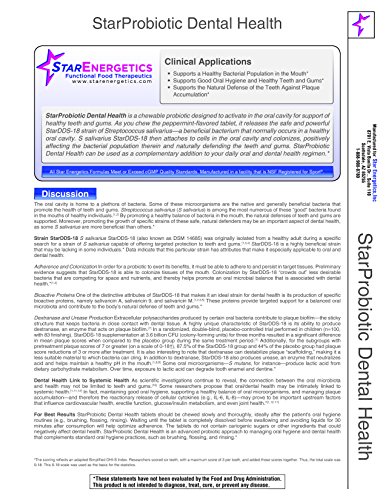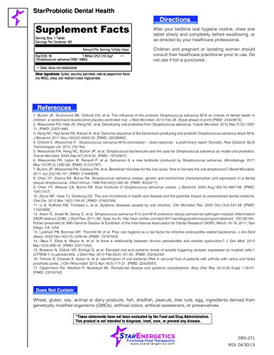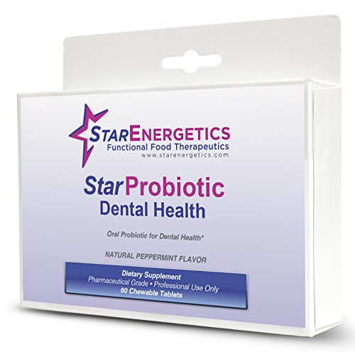 StarProbiotic Dental Health is a chewable probiotic designed to activate in the oral cavity for support of healthy teeth and gums. As you chew the peppermint-flavored tablet, it releases the safe and powerful StarDDS-18 strain of Streptococcus salivarius-a beneficial bacterium that normally occurs in a healthy oral cavity. S salivarius StarDDS-18 then attaches to cells in the oral cavity and colonizes, positively affecting the bacterial population therein and naturally defending the teeth and gums. StarProbiotic Dental Health can be used as a complementary addition to your daily oral and dental health regimen.* Does Not Contain: Wheat, gluten, soy, animal or dairy products, fish, shellfish, peanuts, tree nuts, egg, ingredients derived from genetically modified organisms (GMOs), artificial colors, artificial sweeteners, or preservatives. All Star Energetics Formulas Meet or Exceed cGMP Quality Standards. *These statements have not been evaluated by the Food and Drug Administration. This product is not intended to diagnose, treat, cure, or prevent any disease.