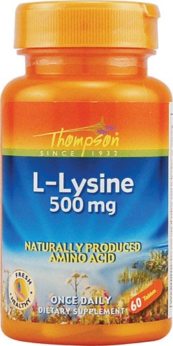 L-Lysine by Thompson 60 Tablet Size 60ct 500mg Tablet Directions As a dietary supplement take one tablet daily. Serving Size 1 Tablet 60 Servings per container Ingredients Amount per serving Daily Value + L-Lysine (as l-Lysine HCl) 500 mg Key to Ingredients Daily Value not established. + Percent Daily Value is based on a 2 000 calorie diet. Values differ depending on age Values differ depending on age Other Ingredients Cellulose stearic acid and silica Other See product label for more information.