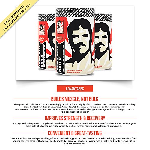 Builds Muscle, Not Bulk: Vintage Build delivers an uncompromisingly dosed, safe and highly effective mixture of 3 essential muscle building ingredients: Branched Chain Amino Acids (BCAAs), Creatine Monohydrate, and L-Glutamine. This no-nonsense combination has been proven to work and is what gives Vintage Build its designation as a Triple Crown muscle builder.